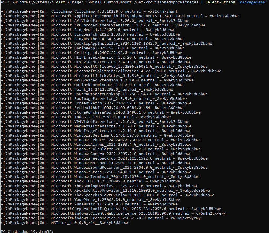 dism /Image:C:\Win11_Custom\mount /Get-ProvisionedAppxPackages | Select-String "PackageName"