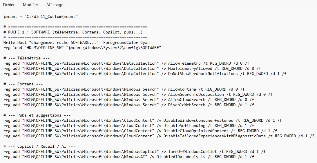 C'est l'étape la plus importante. On va charger les fichiers de registre de l'image montée et appliquer des centaines de modifications pour désactiver la télémétrie, les publicités, Cortana, Copilot, et verrouiller les services espions.