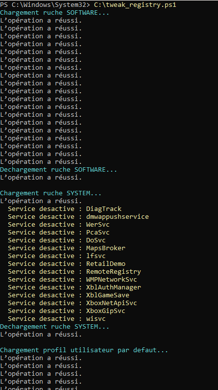 Vous devriez voir "L'opération a réussi." pour chaque clé, et la liste des 15 services désactivés.