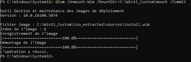 dism /Unmount-Wim /MountDir:C:\Win11_Custom\mount /Commit